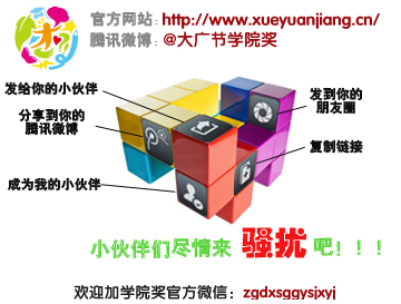 实时了解学院奖的动态,请关注学院奖官方微信(微信号:zgdxsggysjxyj)、腾讯微博@大广节学院奖、人人网主页“学院奖”。本届学院奖网上报名通道已开通,同学们可以登录学院奖官网www.xueyuanjiang.cn进行网上报名和了解赛事信息。